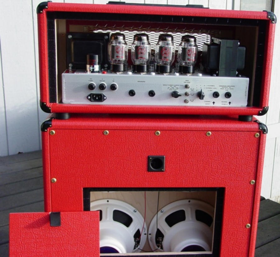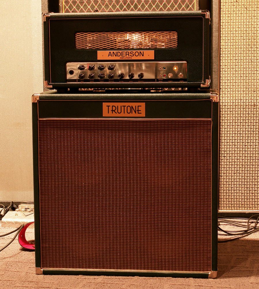 As the photos in the “Anderson Amps” album show, Jack’s amps are contagious to say the least. The following are short write ups on each of the Anderson Amps owned by the Eurotubes crew. The Green Anderson shown by itself on the Trutone cab is an “18/20/30” model and uses a pair of EL84’s and a pair of 6V6’s. It belongs to a longtime customer of ours Kris Siewell.