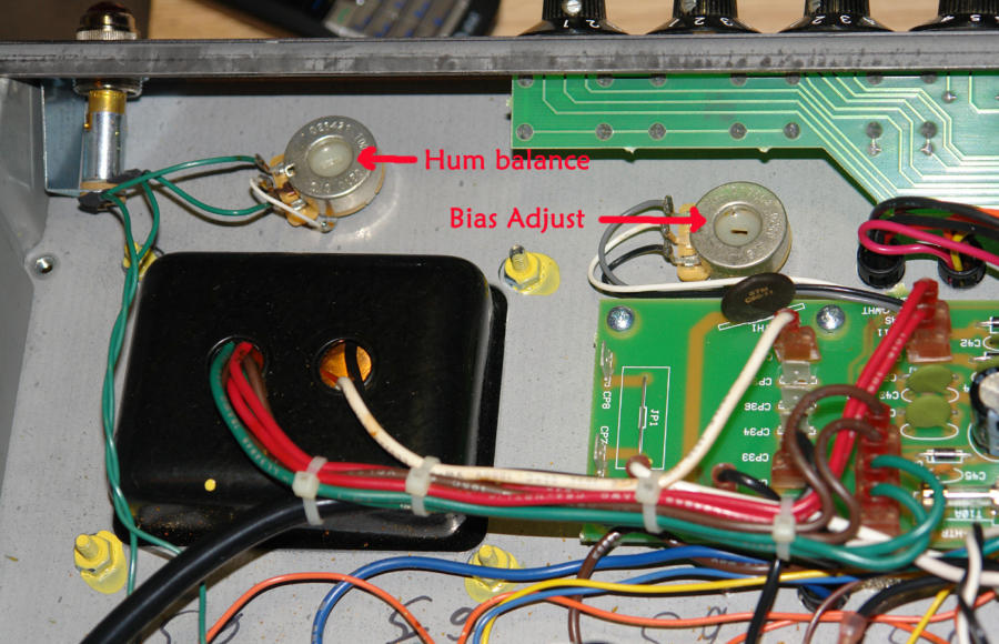 The Reissue Twin and Super Reverb amps also have a hum balance pot located down underneath the chassis in front of the transformer on the pilot light side of the amp. The access hole looks just like another 1/4″ jack hole and can be adjusted to minimize the amps hum simply by turning the screw with a small screwdriver. Here is a pic of bias trim pot and hum balance pot from inside the chassis.