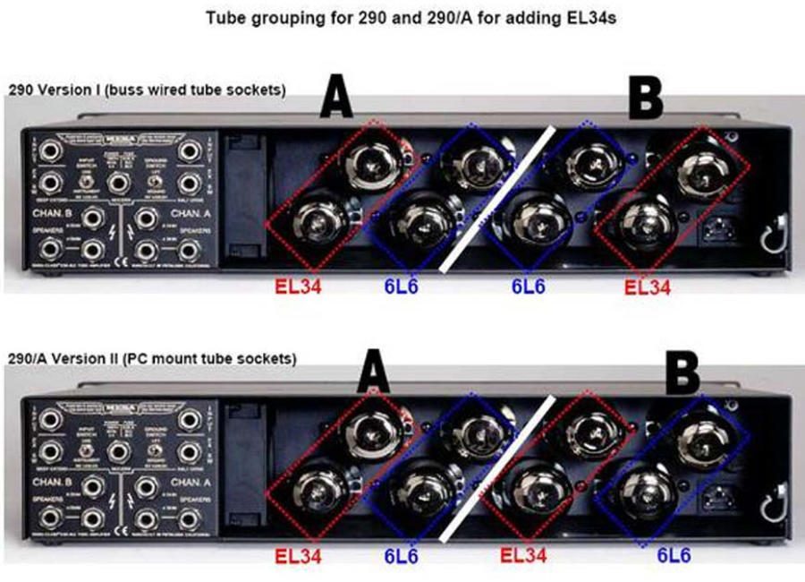 If you decide to run and integrated set of tubes then you need to know which 290 you have. The older 290’s have a blue pilot light and the fuse located directly above the pilot light. If your 290 is a newer model it will have a red pilot light and the fuse is (conveniently) located on the back of the amp. Below are a couple pic’s of how the tube sets are orientated for series I and series II amps.