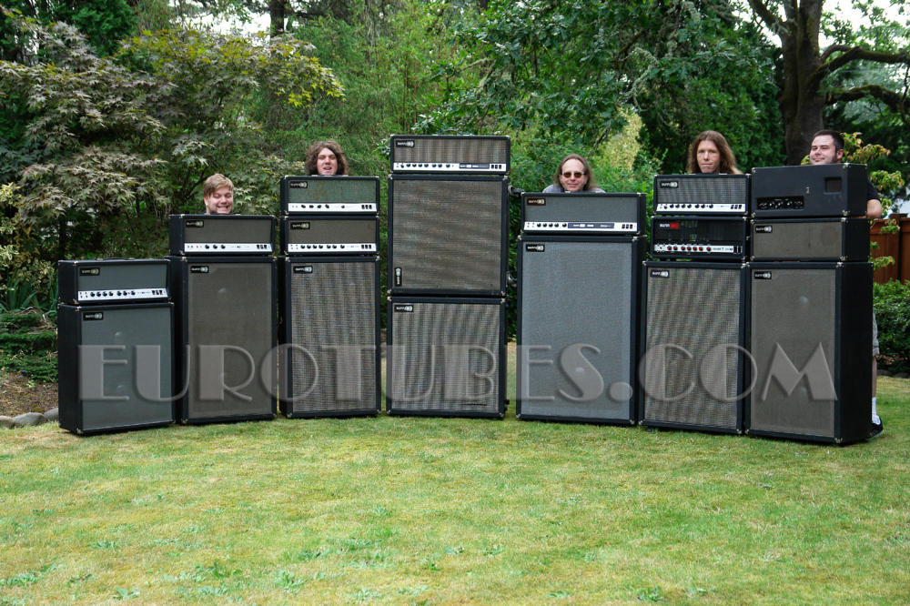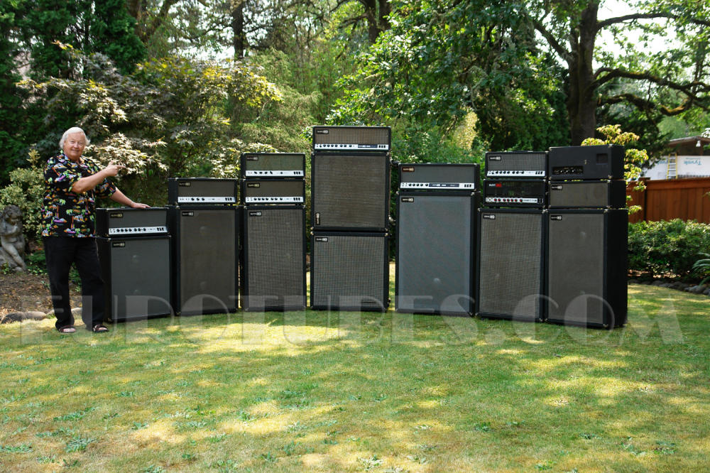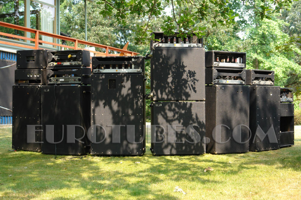The fifth stack is an original 1000S cab shown here with a 1200S amp on top. I very carefully removed the top baffle board holding a JBL 15″ and JBL horn and replaced it with a new baffle board holding four 12″ Celestion 70’s so it’s now a hybrid 4X12 and 1X15 that I can put back to stock at any time. In it’s current configuration as a 4X12 and 1X15 we refer to is as the “Gawd” cabinet. This seems to be the reaction from just about anyone who plays it. The first word usually said is “GeeaawD!”