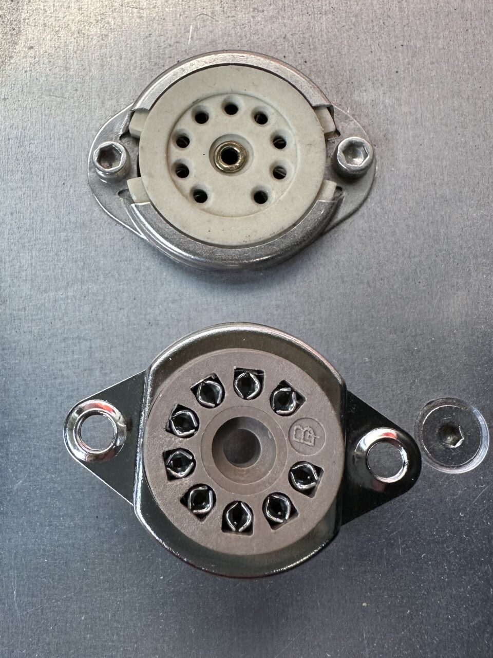 There are a variety of different socket terminals. Most terminals can be accessed externally for the purpose of re-tensioning. However not all sockets have fully exposed contacts. In the pic below you can see a Belton Micalex novel socket next to a classic ceramic socket with “hidden” contacts. Sockets with hidden contacts cannot be re-tensioned and should be replaced as necessary.