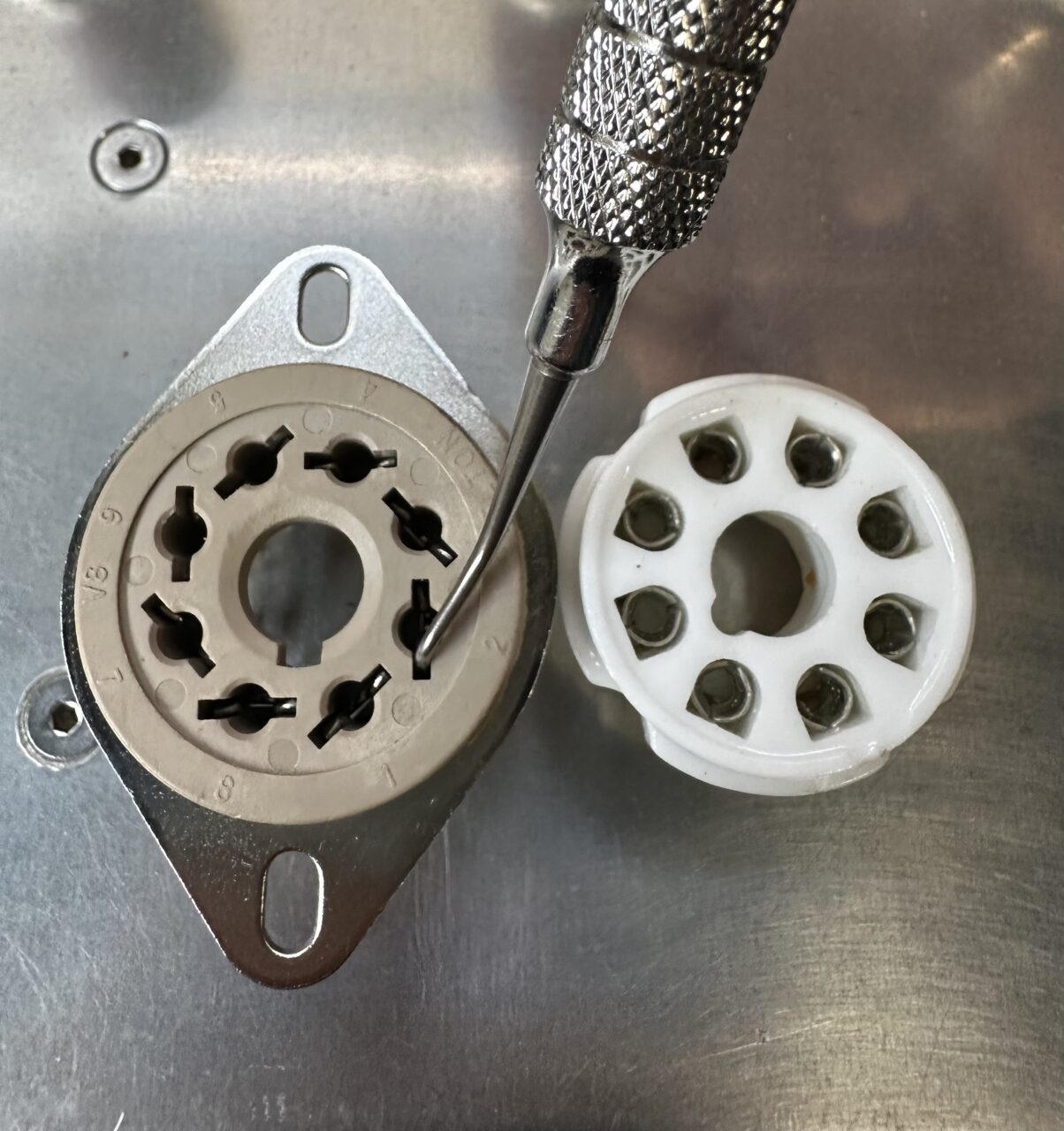 Re-tensioning tube sockets is often necessary when working on vintage gear, gear with low quality sockets, or in cases where tubes with blobs of solder on the pins have been previously installed. There are several styles of pin receptacles. Most of them can be re-tensioned. Before we proceed please keep in mind that re-tensioning sockets requires sticking a sharp, typically conductive tool into the socket contacts where high voltages and currents would normally be transferred to the tube. Your amplifier must be turned off, unplugged from the wall, and fully discharged before making contact with any of the socket terminals. Most modern amps have provisions to bleed down the voltage in the power supply once the amp is turned off. Many vintage amps do not. If you’re unsure you can check for DC voltage on any pin (measuring from the socket terminals to chassis ground) with a multimeter. Everything should be drained down to under a volt or two before proceeding. If higher voltages are present do not continue.
