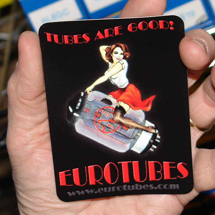 01/27/09 We just got the new Eurotubes Tube Girl stickers in! We have had so many requests for these that we had to do it. They are 3″ X 4″ vinyl bumper stickers that are UV coated so you can stick them on windows, bumpers, guitar cases, amps, girl friends and just about anywhere! These are now in the online store for 1.00