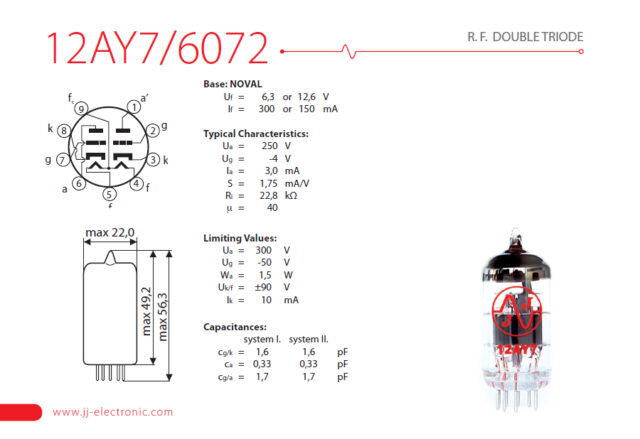 The JJ 12AY7 / 6072 is a high quality, low noise purpose built 12AY7. Also available with current Balanced triodes for phase inverter use and Balanced and Matched in pairs or multiples.