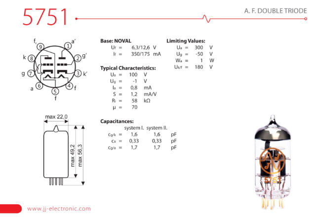 The JJ 5751 is a high quality, low noise tube built to classic 5751 specs. Although this tube uses JJ’s classic short plate design, it was engineered from the inside out as a purpose built 5751 rather than a low test 12AX7.