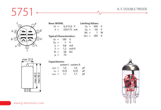 The JJ 5751 is a high quality, low noise tube built to classic 5751 specs. Although this tube uses JJ’s classic short plate design, it was engineered from the inside out as a purpose built 5751 rather than a low test 12AX7.