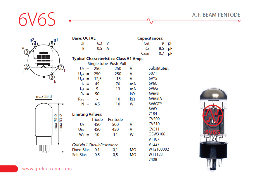 These tubes can be used in applications up to 500VDC on the plates. In lots of EL34 and 6L6 amps the JJ 6V6 can be used as a lower power substitute. In many cases all that’s required for this is a simple bias adjustment. If you’re unsure about your application please contact us!