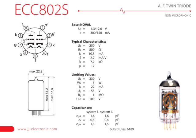 The JJ ECC802S is a long plate and gold pin version of the classic 12AU7. These tubes utilize an extremely long plate design that combined with the gold pin processing (which includes an additional selection and processing of internal components), results in a very different tonal signature compared to their classic ECC82’s.