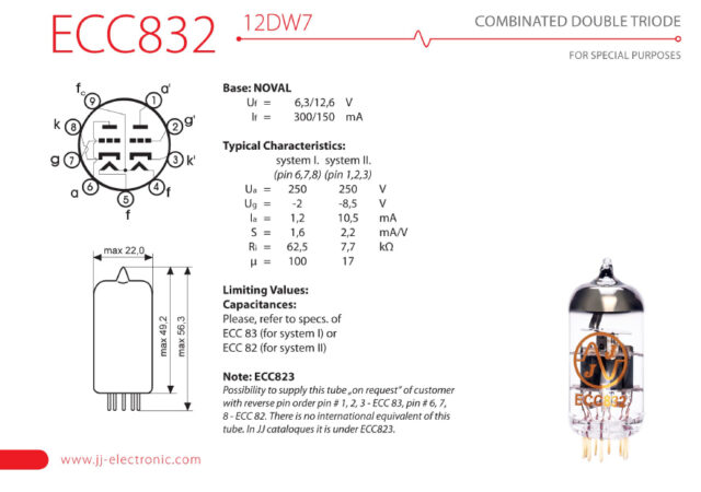The JJ ECC832 is a faithful reproduction of the classic 12DW7. Utilizing JJ’s short plate structure design, you get one low gain triode (12AU7/ECC82 spec), and one high gain triode (12AX7/ECC83 spec) in the same bottle. While there are several applications designed specifically for these tubes (Ampeg guys we’re talking to you!), they also make great low gain substitutes allowing you to reduce gain in pinpointed stages.