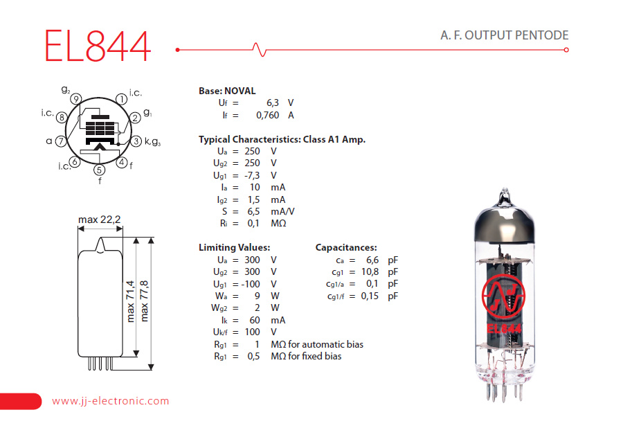 With adjustable bias amps like the Marshall 201 and 401 or Bugera V22, Jet City or Carvin, these must be biased 25% lower than standard EL84’s to compensate for the wattage drop (12 vs 9 watt maximum dissipation). For those of you who are familiar with the old EL83, the EL844 plate structure is quite similar but the EL844 is NOT a replacement for an EL83!!! It is quite different.