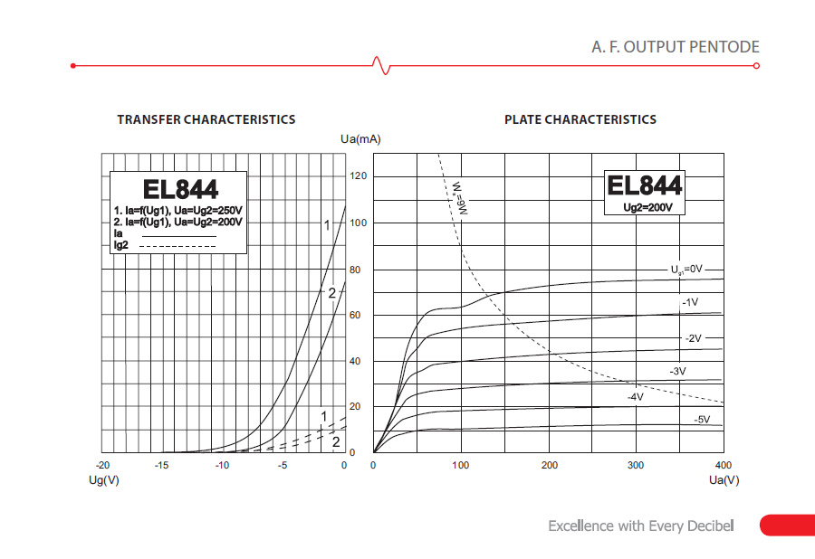 A note for the DIYers, the EL844 makes an excellent driver tube in triode mode. Try 250V B+, -5.8Vg1 (or 230Ω Rk), which will provide aprx. 25mA Ip, 11.3mA/V Tc, 2K6 Rp, and a real mu of 27.