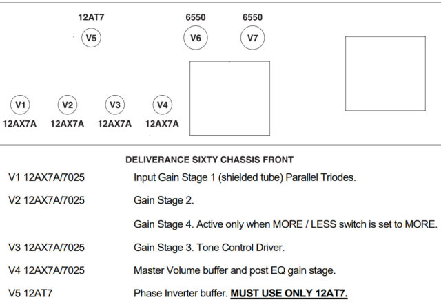 The ECC803S V1 Option Retube Kit uses the Long Plate JJ ECC803S in the V1 position. The JJ Long Plate ECC803S has a little lower gain with big thick mids and a little more sparkle in the highs. The kit includes one matched pair of JJ KT88’s by default, one Balanced JJ ECC81 for the phase inverter (V5, closest to the power tubes), three Standard JJ ECC83S’s for V2 – V3 – V4 and one Standard JJ ECC803S for V1 (closest to input jack).