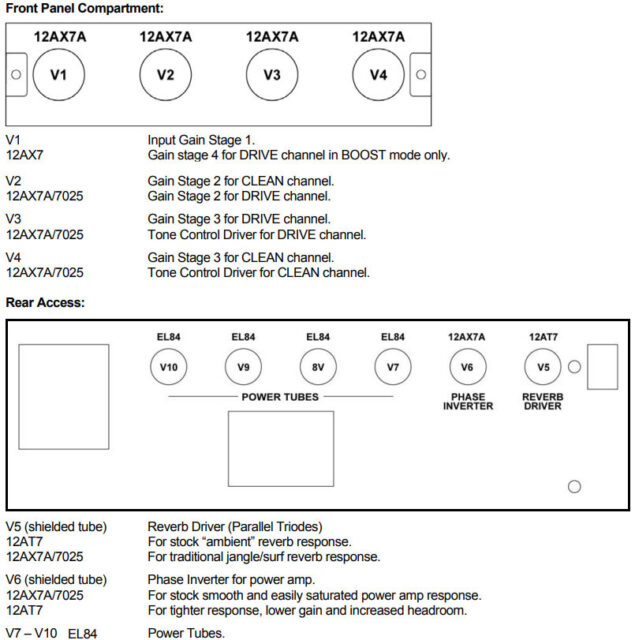 The Standard Retube Kit is as close to OEM as possible. Maintaining the amps stock level of headroom and gain while providing a warm but even handed overall sound. The kit includes one Matched quad of JJ EL84’s by default, one current Balanced ECC83S for (V6, closest to the power tubes), one Standard ECC81 for V5 and four Standard JJ ECC83S’s for V1 – V2 – V3 – V4.