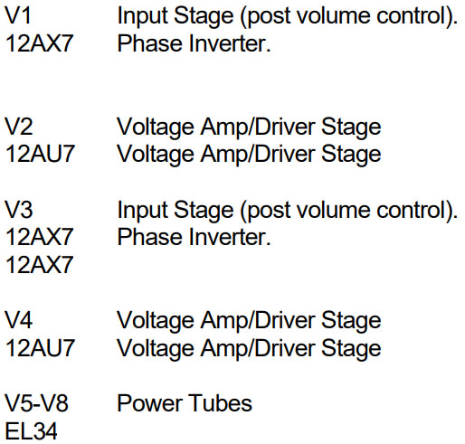 The Standard Retube Kit is as close to OEM as possible. Maintaining the amps stock level of headroom and gain while providing a warm but even handed overall sound. The kit includes one matched quad of JJ E34L’s by default, two Matched and Balanced JJ ECC83S’s for the phase inverters (V1 – V3, replacing the 12AX7’s), and two Matched and Balanced JJ ECC82’s for V2 – V4 replacing the 12AU7’s.