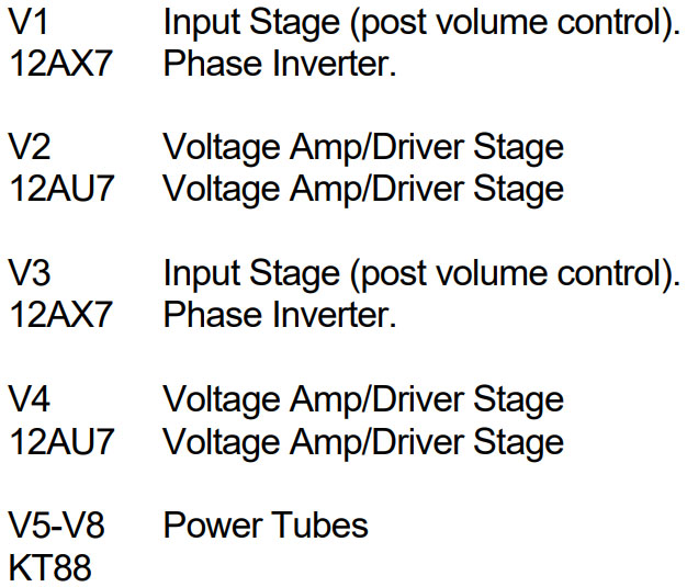 The Standard Retube Kit is as close to OEM as possible. Maintaining the amps stock level of headroom and gain while providing a warm but even handed overall sound. The kit includes one matched quad of JJ KT88’s by default, two Matched and Balanced JJ ECC83S’s for the phase inverters (V1 – V3, replacing the 12AX7’s), and two Matched and Balanced JJ ECC82’s for V2 – V4 replacing the 12AU7’s.