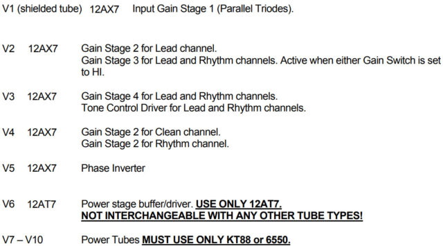 The ECC803S V1 Option Retube Kit uses the Long Plate JJ ECC803S in the V1 position. The JJ Long Plate ECC803S has a little lower gain with big thick mids and a little more sparkle in the highs. The kit includes one matched quad of JJ KT88’s by default, one Balanced JJ ECC81 for the Driver Tube (V6, closest to the power tubes), one Balanced ECC83S for the phase Inverter in V5, three Standard JJ ECC83S’s for V2 – V3 – V4 and one Standard JJ ECC803S for V1 (closest to input jack).