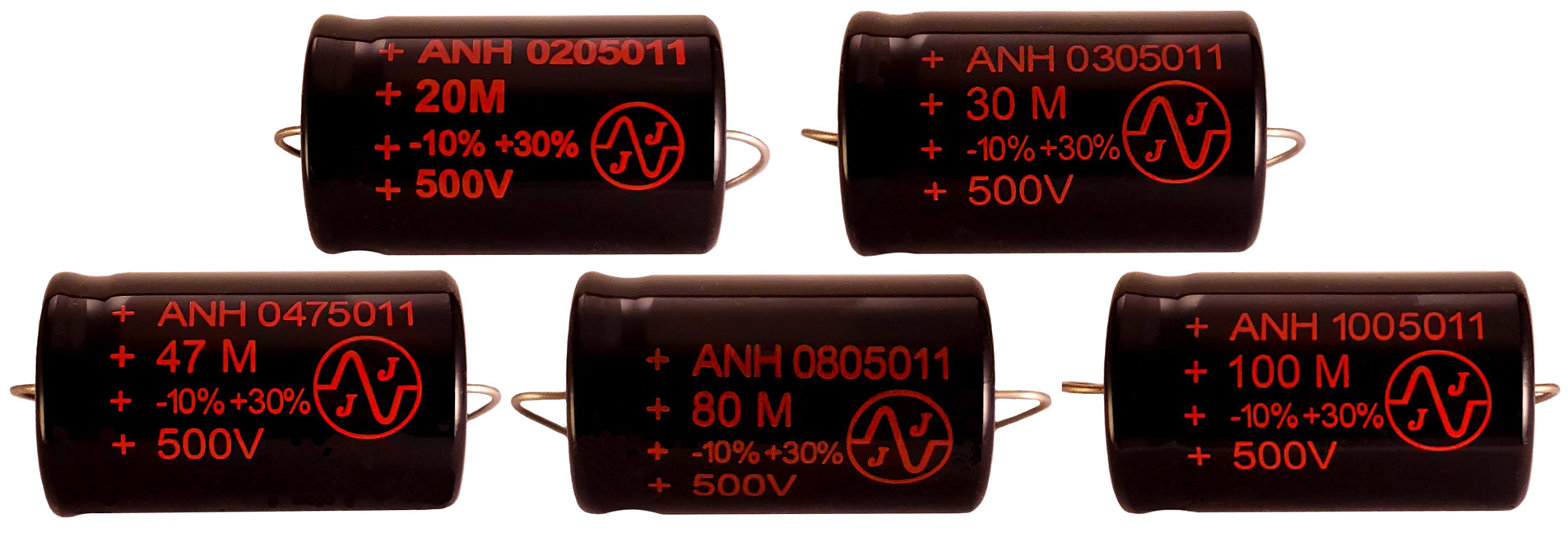 JJ Electronic Axial Capacitors. Made right in the JJ tube factory, these are great current production axial electrolytics. Ideal for servicing vintage amplifiers or for use in modern designs.