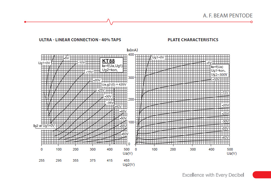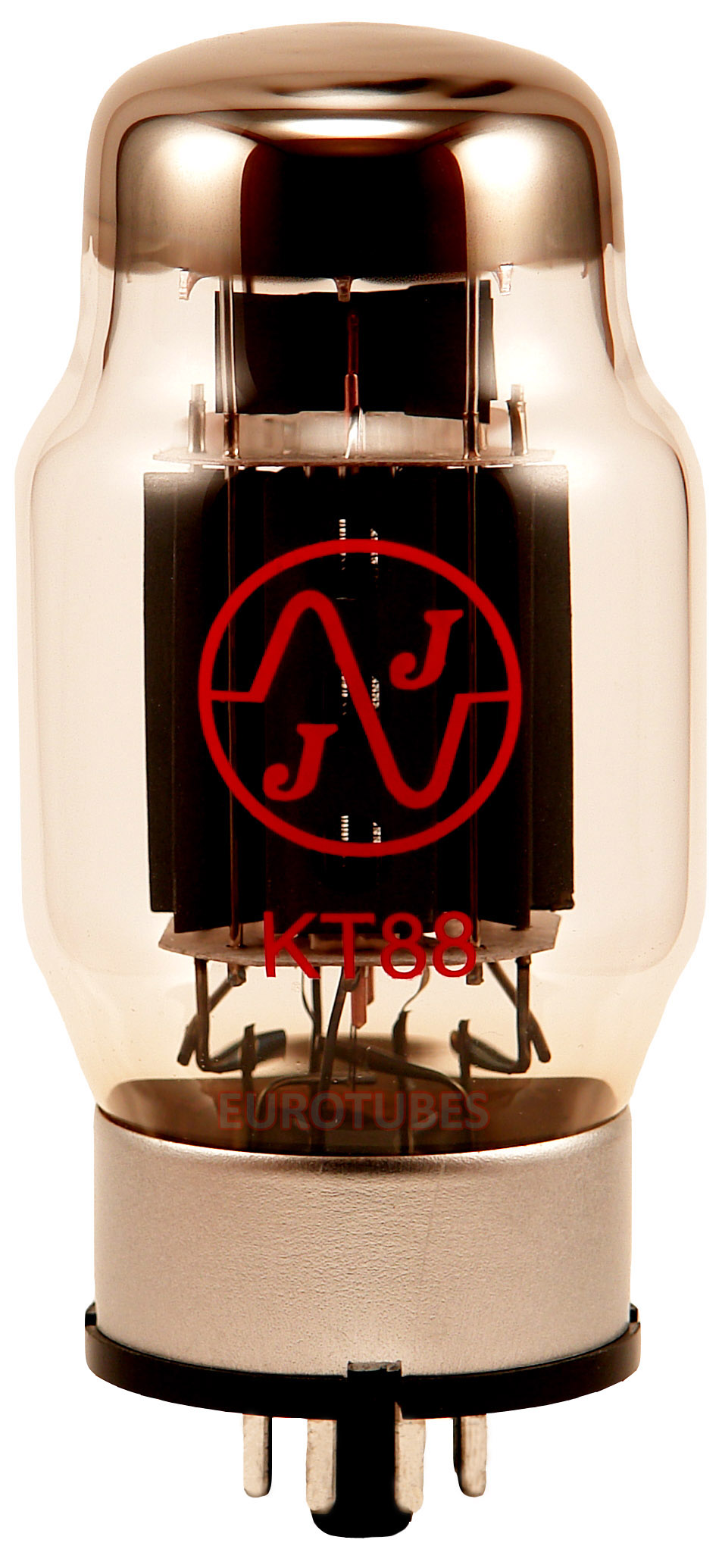 The JJ KT88 is just as at home in an Ampeg SVT, or Sunn Model-T, as it is in a classic Mcintosh MC275. The JJ KT88 is a true beam aligned Kinkless Tetrode. Unlike most other modern KT88 variants (Sovtek, EH, Genelex reissue) the JJ KT88 reflects true KT construction techniques which are reflected in the screen grid efficiency (max 7mA at typical conditions) and improved turn-on linearity. Like the original GEC’s, the JJ KT88’s can develop 50 watts per tube in the right push-pull applications (Ampeg, Hiwatt, Sound City).