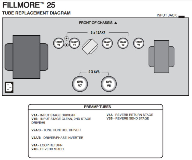 All of our Mesa Boogie Fillmore 25 full Retube Kits are designed specifically for these amps. Every kit is configured to provide a specific sound/experience.