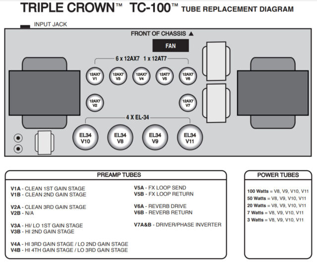 The Standard Retube Kit is as close to OEM as possible. Maintaining the amps stock level of headroom and gain while providing a warm but even handed overall sound. The kit includes one matched quad of JJ E34L’s by default, one Balanced JJ ECC83S for the phase inverter (V7, farthest from the input jack.) one ECC81 for V5 and Five Standard JJ ECC83S’s for V1 – V2 – V3 – V4 – V6.