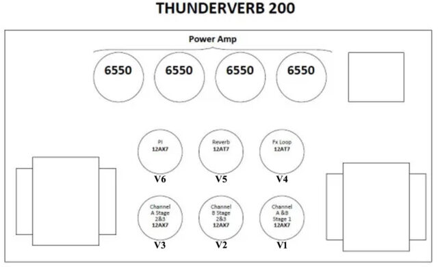 The default power tubes for all the Thunderverb 200 kits are the JJ 6550’s. The JJ 6550’s are very warm with a great clean tone and the breakup is raw, crunchy, and gritty. If you want an Angus – AC/DC type tone then these tubes really deliver! They are simply a lot of fun to play. The JJ 6550 will not make quite as much power as the JJ KT88 and the KT88 is a bit thicker sounding. The JJ KT88’s are another option, these are extremely thick and rich sounding, they are a very high power tube with lots of headroom, thunderous lows, thick/aggressive mids, and sweet detailed highs.