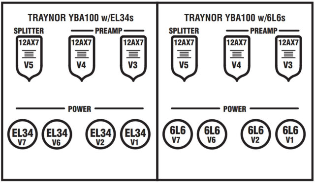 The ECC803S V1 Option Retube Kit uses the Long Plate JJ ECC803S in the input position which is normally V1 but Traynor decided it’s V3. The JJ Long Plate ECC803S has a little lower gain with big thick mids and a little more sparkle in the highs. The kit includes one matched quad of JJ 6L6GC’s by default, one Balanced JJ ECC83S for the phase inverter (V5, see tube chart below), one Standard JJ ECC83S’s for V4 and one Standard JJ ECC803S for V3 (closest to input jack).
